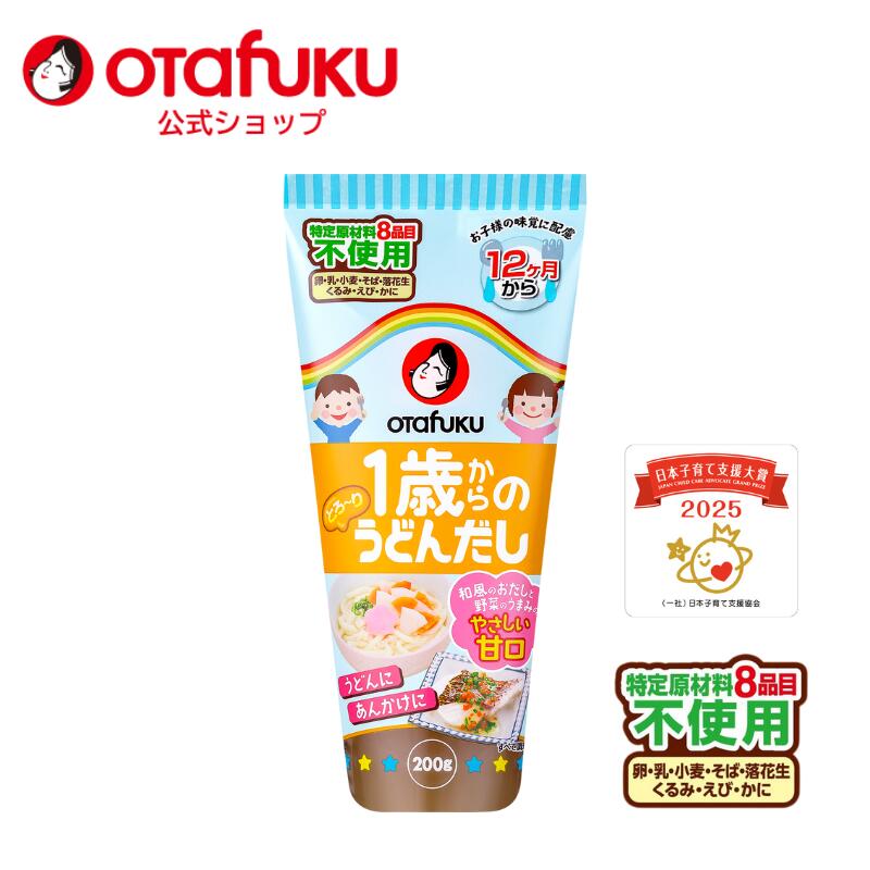 | 4 |  | 【オタフク公式オンラインショップ】 鰹と昆布の旨味が効いたうどんだし。麺に絡みやすいとろみ付。野菜の甘味や旨味をほのかに加えています。着色料、保存料などを配合せず、特定原材料8品目(卵、乳、小麦、そば、落花生、くるみ、えび、かに)も使用していません。 名称:1歳からのうどんだし 200g 内容量:200g 原材料:糖類 ... |