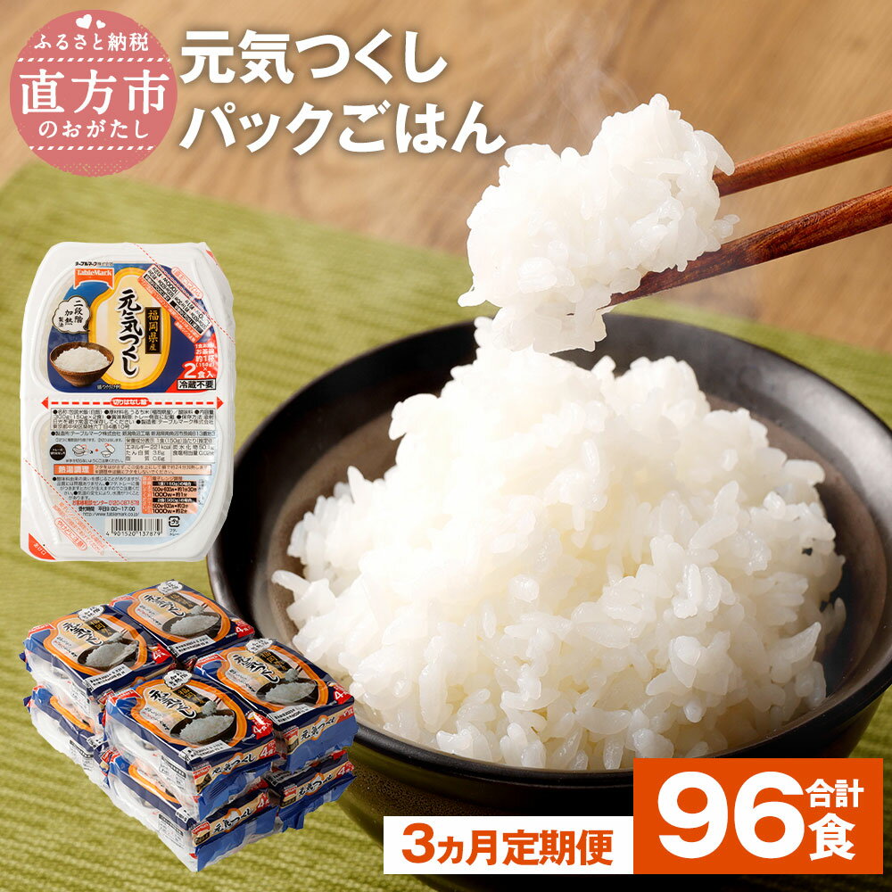 | 21 |  | 【福岡県直方市】 商品説明 品名 【3ヶ月定期便】テーブルマーク 元気つくしパックごはん 産地 福岡県産 内容量 <1回あたり>150g×32食入り 原材料名 うるち米(福岡県産)/酸味料 賞味期限 容器側面に記載 保存方法 高温・多湿・直射日光を避け、涼しい場所に保管してください。 開封後はお早めにご賞味くださ ... |