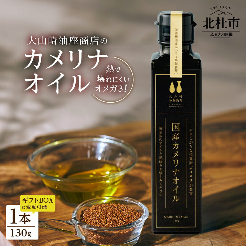 | 3 |  | 【三重県伊賀市】 販売開始:2023/03/31 09:00 販売終了:2999/12/31 23:59 ...健やかに 日本の「健やかな暮らし」を実現する為に、全国の農家さんと手を取り合い次世代の健康油「カメリナオイル」をお届けします。 〇京都・大山崎からカメリナオイルの国産化に挑戦 えごま油発祥の地であり、油座として栄えた京都・大山崎。大山崎油座商店は、由緒ある油の町で ... |