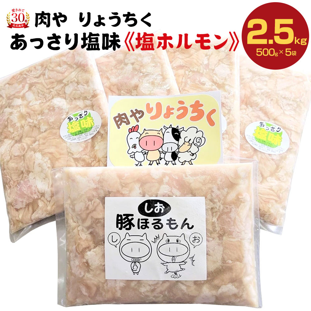 | 11 |  | 【北海道北広島市】 レビュー:2件 北海道北広島市で愛されて30年 「肉や りょうちく」のあっさり塩味のホルモンです。 商品説明 名称 塩ホルモン 産地 アメリカ産又はチリ産 加工地 北海道北広島市 内容量 500g×5袋 合計 2.5kg 原材料名 ・アメリカ産又はチリ産の豚直腸 ・たれの原材料名:食塩、ガーリックパウダー、たん白加水分 ... |
