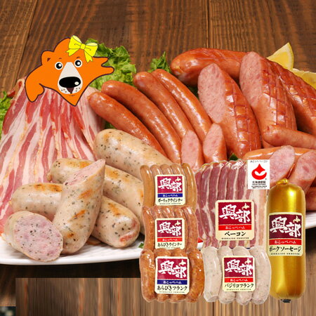 | 2 |  | 【北海道 ギフト・タネ 実 蔵本舗】 惣菜 はこちら 興部ハム 商品一覧 はこちら 名称:北海道 興部ハム ソーセージ ベーコン セット 内容量: ・ベーコン ブロック 300g ・あらびき ウインナー 110g ・ガーリック ウインナー 110g ・バジリコフランク 240g ・北海道ポークフランク 300g ( 各 北海道産 豚肉 ) 賞味期限:ソーセージ 詰め合わ ... |