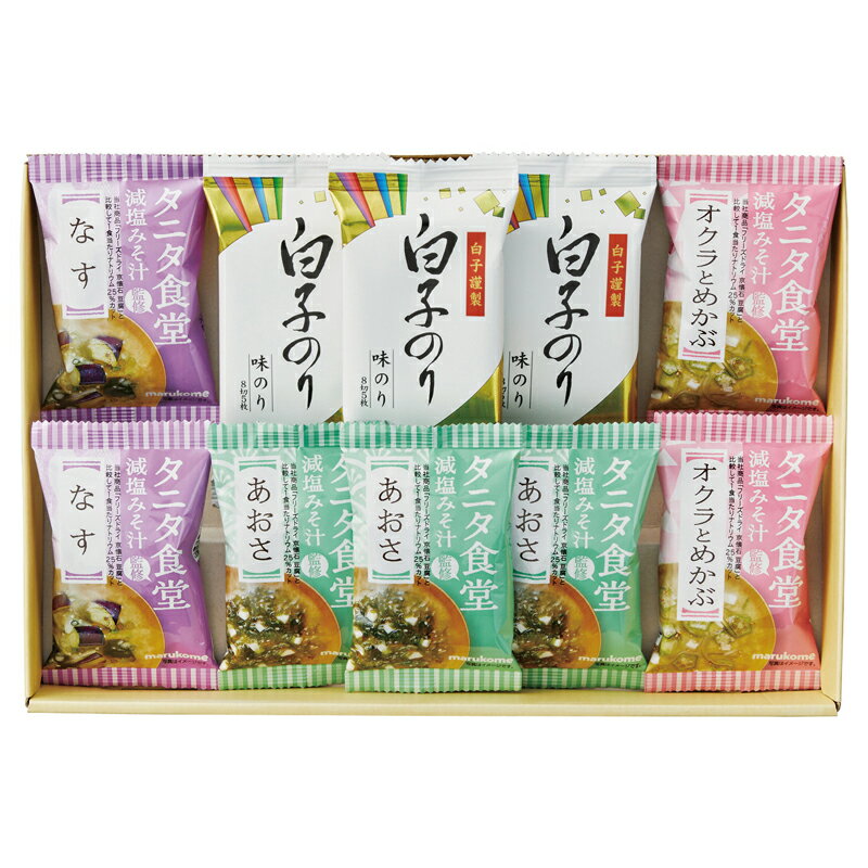 | 25 |  | 【暮らしのギフト 「Lumiere」】 商品詳細タニタ食堂監修減塩みそ汁・白子のり詰合せ丸の内タニタ食堂の減塩みそを使用したフリーズドライおみそ汁。みその甘みを活かしたやさしい味わいにだしを加えておいしく仕上げました。白子のり味のリを詰合せたギフトです。商品スペック ●タニタ食堂監修減塩みそ汁(あおさ×2、な ... |