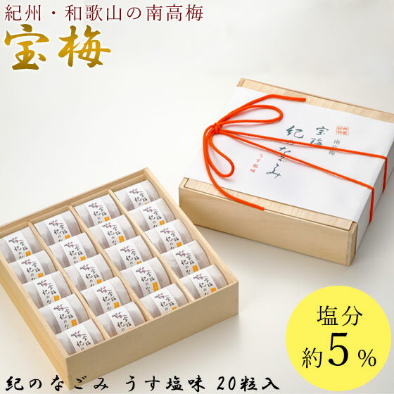 | 7 |  | 【暮らしと眠りを楽しむ店 和っふる】 レビュー:1件 商品情報 株式会社酒直 宝梅紀のなごみ うす塩味20粒 XH-62 (和紙調風呂敷・木箱入り) 品番:XH-62 塩分:約5% 内容量:20粒 梅干サイズ:4L ※シーズンにより大きさが異なることがございます。 賞味期限:製造月から約6ヶ月 保存方法:直射日光を避け、冷暗所に保存 原材料:梅、漬け原材料(食塩 ... |