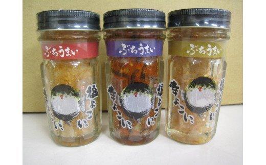 | 30 |  | 【山口県下関市】 商品説明 内容量トラフグ皮キムチ60g×1本 マフグ旨辛漬 60g×1本 マフグ旨辛漬明太60g×1本 消費期限ラベルに記載 ※目安として出荷後180日 アレルギー表示 原材料の一部に乳・小麦・かに・さけ・豚肉・ごま大豆・りんごを含みます。 ※ 表示内容に関しては各事業者の指定に基づき掲載しており、一 ... |