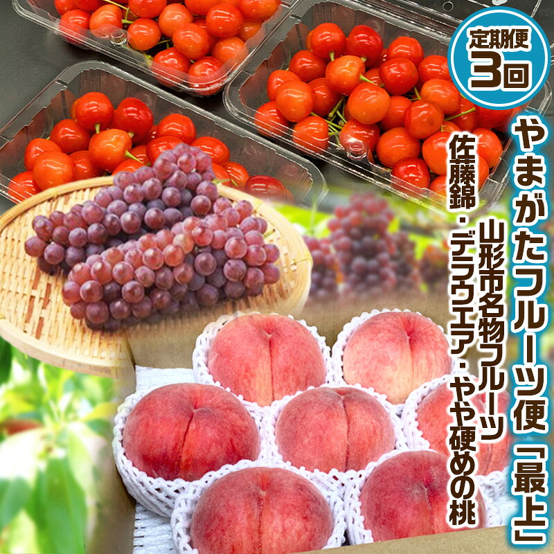 | 7 |  | 【山形県山形市】 販売開始:2025/11/07 00:00 販売終了:2026/05/15 23:59 商品説明 名称 【定期便3回】やまがた フルーツ定期便 ”最上” 山形名物フルーツ 産地名 山形産 内容量 【令和8年産】 1回目:さくらんぼ 佐藤錦 Lサイズ 約540g (約180g×3パック) (6月10日〜7月10日) 冷蔵 2回目:デラウェア 約1.5kg M〜2Lサイズ 秀品 (7月20日〜8月20日) 冷蔵 3回目:白桃 (やや硬め) 約2kg (4 ... |