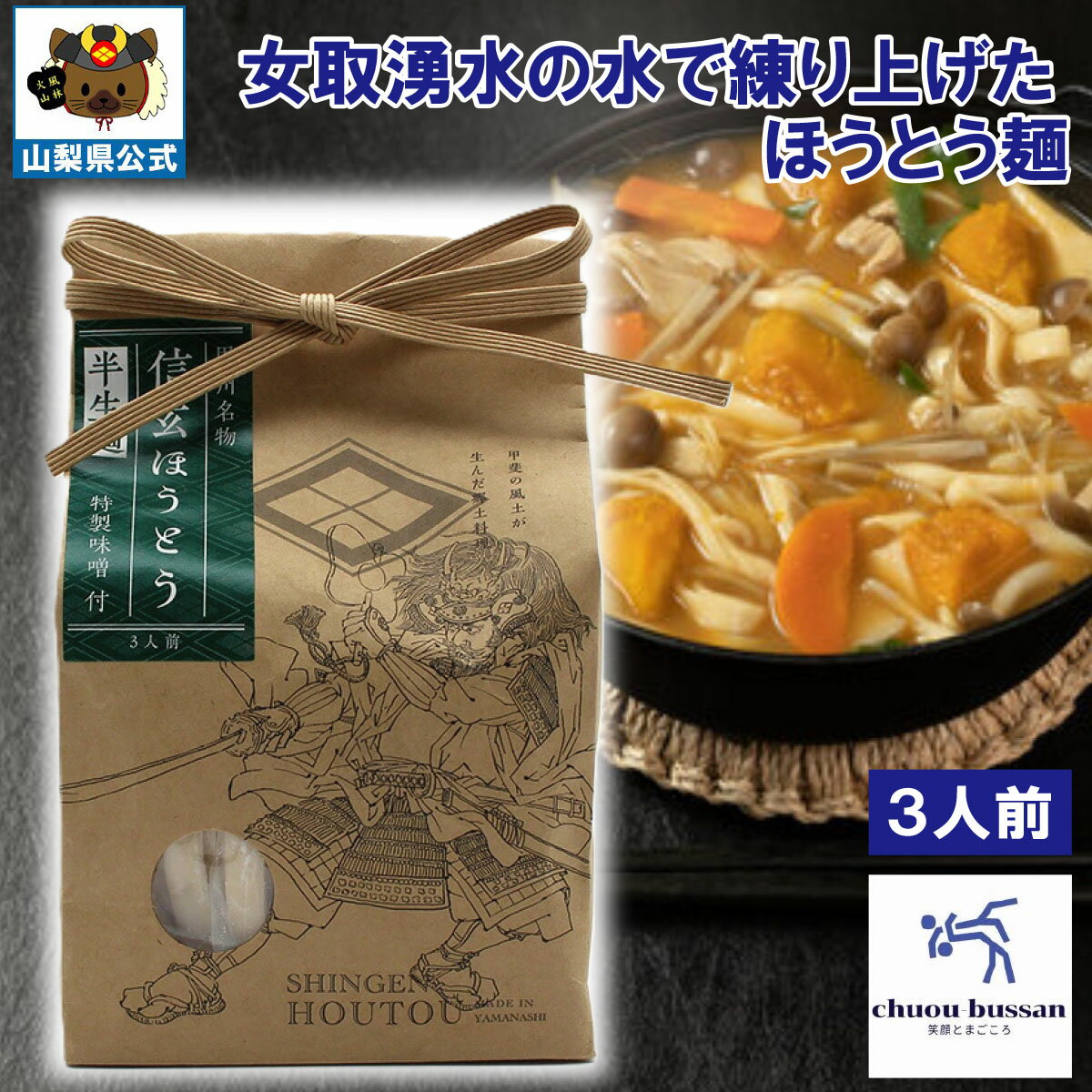 | 30 |  | 【富士の国やまなし特産品】 八ヶ岳南麓湧水群の一つ”女取湧水”の水で練り上げたほうとう麺。 幅広・肉厚の麺が特徴で、もちもちとした食感が楽しめる商品。 高級感もあり信玄の顔の迫力がなんとも言えません…。 麺はもちもちしていて味噌がよく染み込みます。 山梨の逸品を様々なシーンでご利用ください。 【季節 ... |