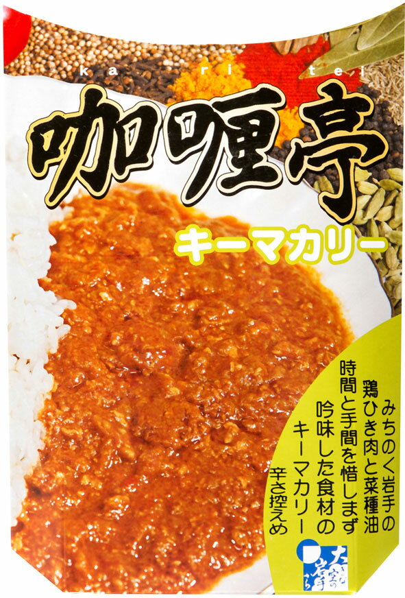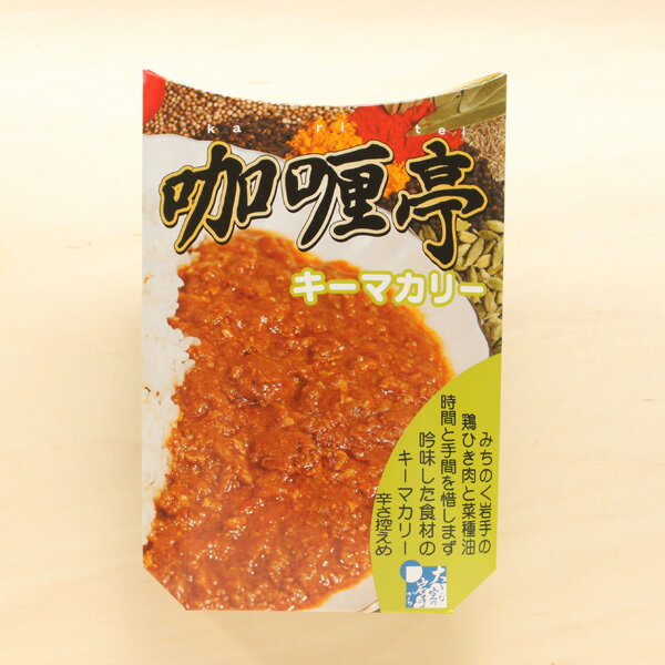 | 8 |  | 【らら・いわて 楽天市場店】 岩手県産の鶏肉(胸ひき肉)を岩手県大東町の菜種油で炒めて、旨みをひき出した玉ねぎ、天日塩だけで味をととのえ手間暇惜しまず調理しました。美味しい咖哩亭のキーマカレーをお届けします。 品名:カレー 原材料名:鶏肉(岩手県産)、タマネギ、バナナ、パイナップル、野菜ジュース( ... |