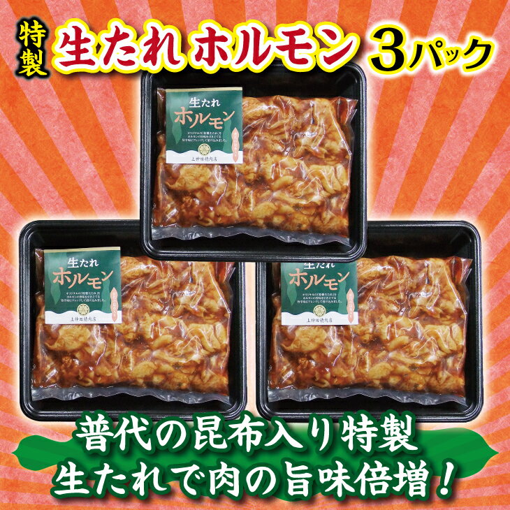 | 25 |  | 【岩手県普代村】 商品説明 名称 生たれホルモン(豚) 商品説明 鍋でよし!炒めてよし! 『普代の昆布入り・特製 生たれ』を、ホルモンの旨味を引き立てるおいしい旨辛味にアレンジしました。 プルプル触感が美味しい、新鮮な大腸のみを使用しています。 内容量 生たれホルモン(450g)×3パック 原材料 生たれ ... |