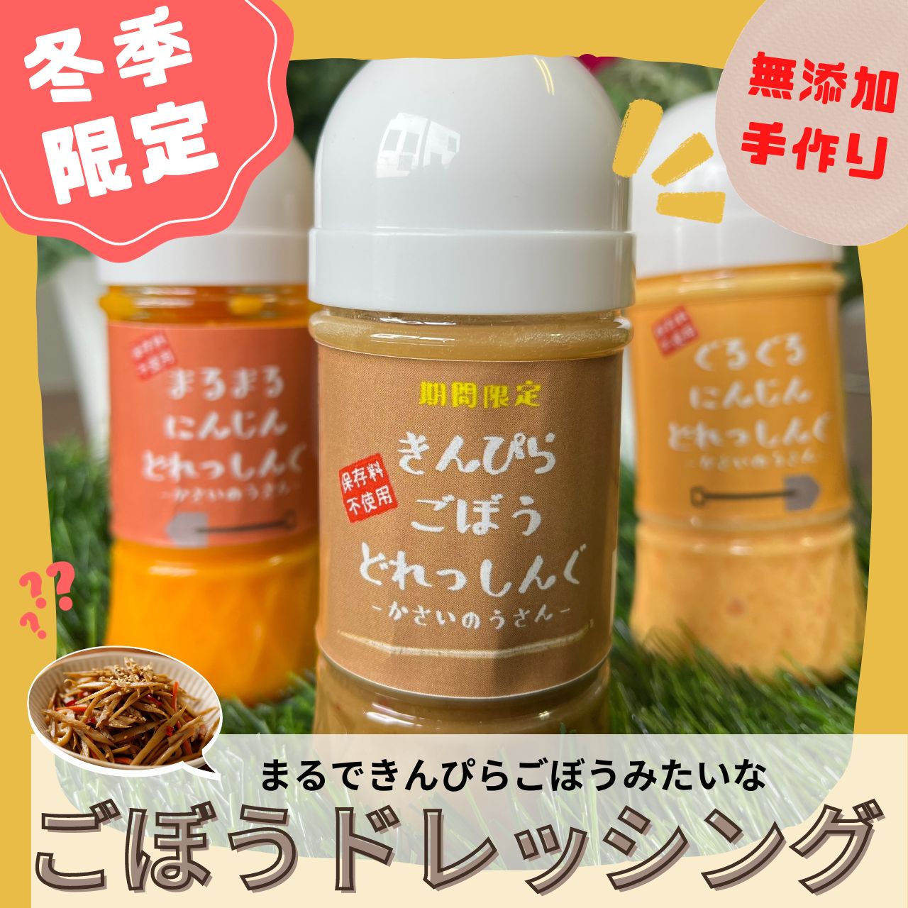 | 26 |  | 【かさい農産】 レビュー:2件 販売開始:2025/12/01 00:00 販売終了:2026/03/31 00:59 産地名国産(岩手県一関市産)内容量150ml保存方法高温、直射日光を避けて保存してください名称分離液状ドレッシング原材料名食用植物油脂(国内製造)、ごぼう(岩手県産)、砂糖、食塩、しょうゆ、唐辛子、りんご酢(一部にりんごを含む)製造所Vegefruハーモニー渡邉淳子 岩手県一関市花泉町涌津字 ... |