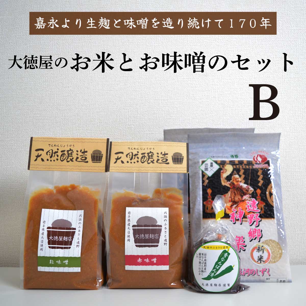 | 11 |  | 【岩手県遠野市】 返礼品について 名称 大徳屋の味噌とお米の詰め合わせ【Bセット】 産地名 岩手県遠野市 内容量 ・赤みそ(500g) ・粒みそ(500g) ・銀河のしずく 300g×2 ・青なんばん漬け 150g ※お米は精米したてのものをお送りしています。 画像では「新米」のシールが貼っていますが、時期によりそうでは ... |