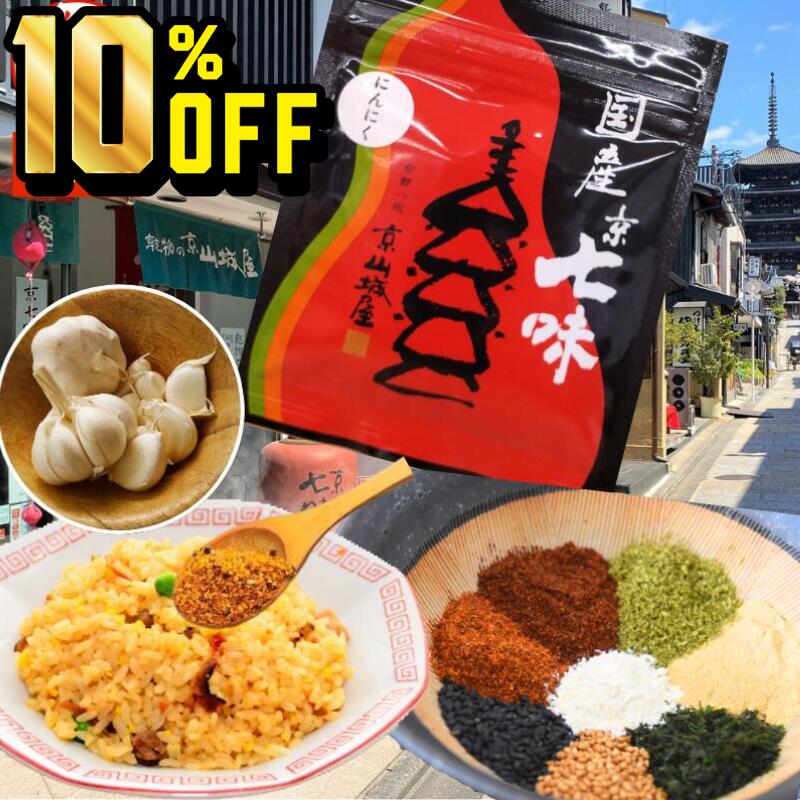 | 4 |  | 【乾物の山城屋 楽天市場店】 販売開始:2025/12/03 20:00 販売終了:2025/12/11 01:59 【4日20時~11日1時59分まで 10%OFF】1000円ポッキリ 送料無料 国産 にんにく 七味 15g×1袋 山城屋 公式 伝統 極上 七味唐辛子 とうがらし うどん そば 焼鳥 鍋物 味噌汁 豚汁 納豆 冷奴 漬物 ラーメン お好み焼き きんぴら 麻辣湯 一味 山椒 ごま 青のり 最強 SALE 10% 京都 東山 八坂 京山城屋で大人気のお土 ... |