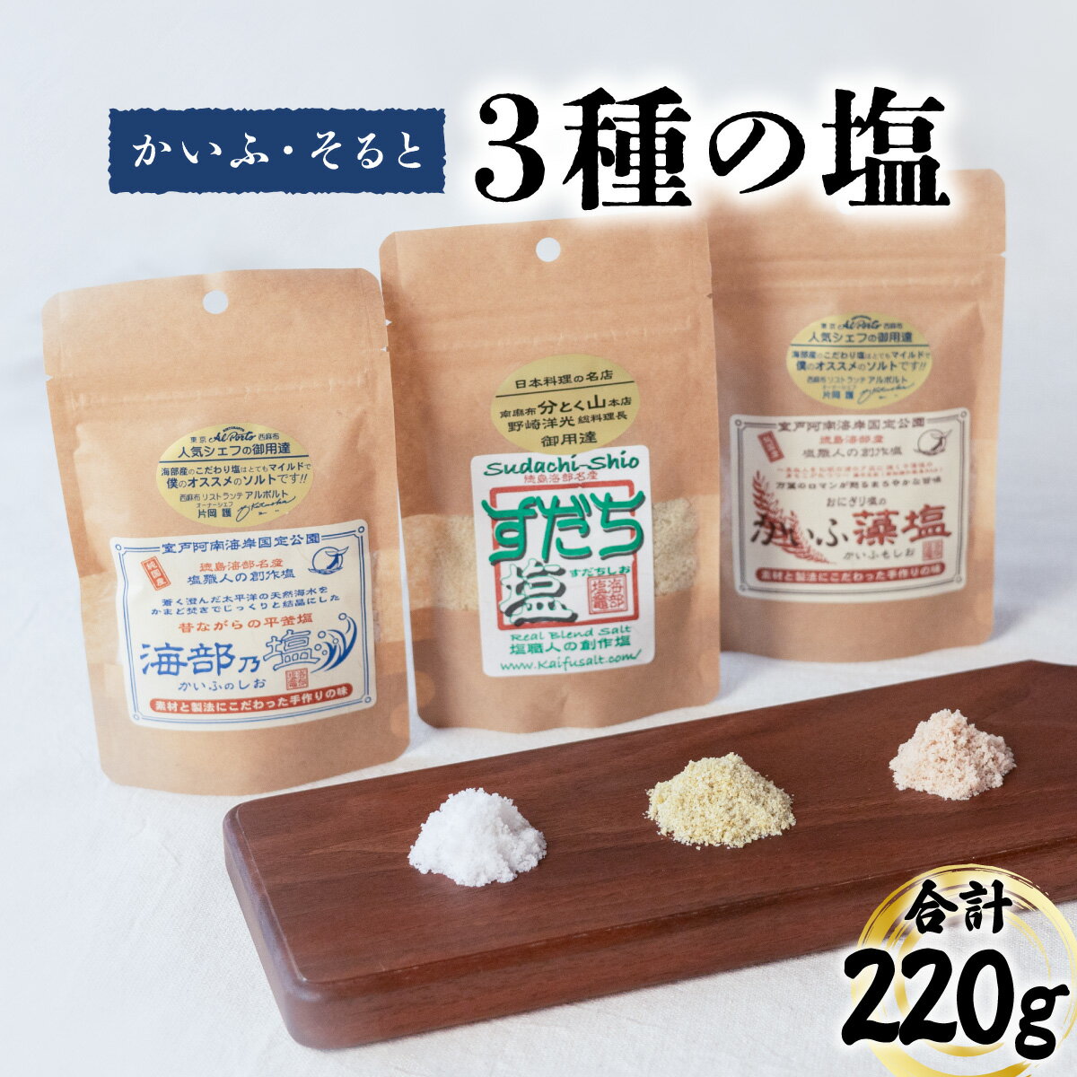 | 15 |  | 【徳島県海陽町】 返礼品説明名称塩 3種 セット内容量 海部乃塩 80g×1袋 かいふ藻塩 80g×1袋 すだち塩 60g×1袋 商品説明 【海部乃塩】 ●純国産の手作り塩 太平洋の黒潮が迫る徳島海部沿岸の新鮮な海水のみを原料とし、平釜の特製竈に薪をくべ続けてじっくりと結晶にした「こだわりの手作り塩」です。 ●素材の旨 ... |