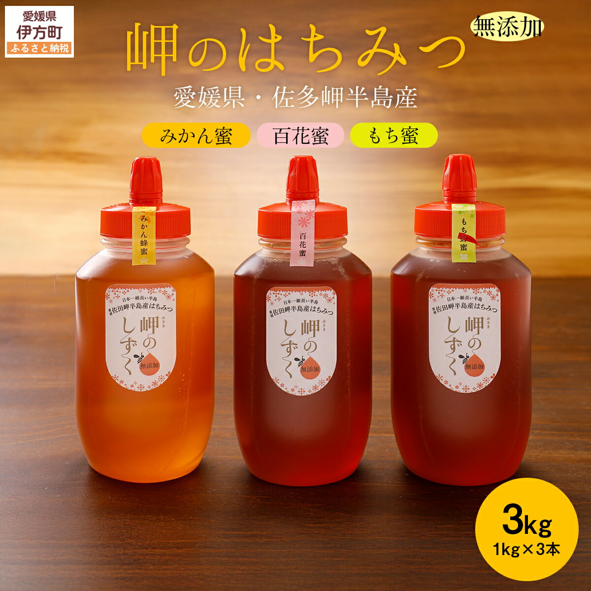 | 11 |  | 【愛媛県伊方町】 名称 【蜂蜜3セット】みかん農園のはちみつ(もち蜂蜜・百花蜜・みかん蜜)| 愛媛県産 伊方町特産品 佐田岬 大岩農園 岬のしずく 蜂蜜 みかん蜜 百花蜜 もち蜂蜜 純国産 無添加 自然の恵み 味比べ ※離島への配送不可 IKTC016 内容量 もち蜂蜜・百花蜜・みかん蜜 各種1kg×1本 返礼品の特徴 愛媛県 ... |