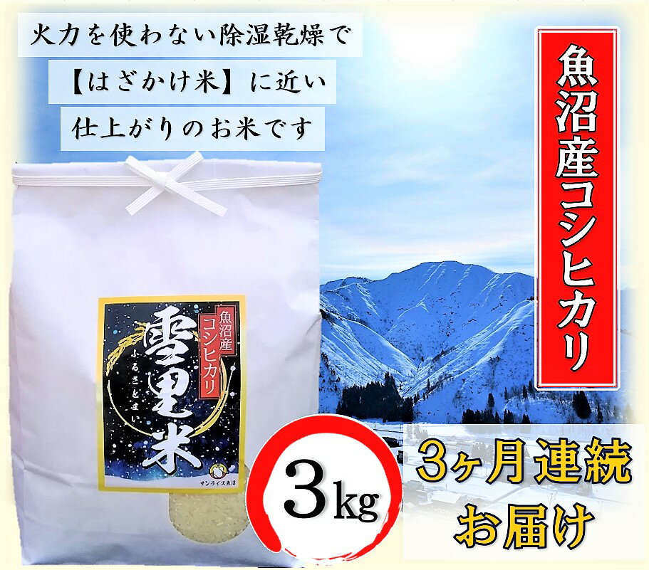| 2 |  | 【新潟県魚沼市 ふるさと納税】 ...い】 精米 3kg 3ヶ月連続お届け お米 ライス ご飯 主食 新潟県産 産地直送 定期便 3回 お届け:寄附入金月の翌月より発送 ■「雪里米」は、魚沼市の湯之谷地区で私たちが生産した魚沼産コシヒカリです。 豪雪地帯の湯之谷地区。田んぼに流れる雪解け水は、自然豊かな大地に養分を与え ... |