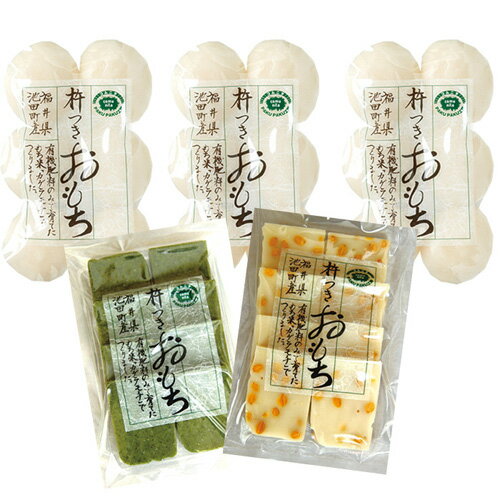 | 4 |  | 【うまいもの福井『かがみや』】 販売開始:2025/11/20 00:00 販売終了:2025/12/20 00:00 12月初旬より発送。美味しいもち米、池田町産のもち米を使い、 ふるさとなつかしいお持ちにしました。 福井県産水稲もち米100%使用 白丸餅6ヶ入り×3袋 切餅(よもぎ、大豆)各8枚入各1袋 |