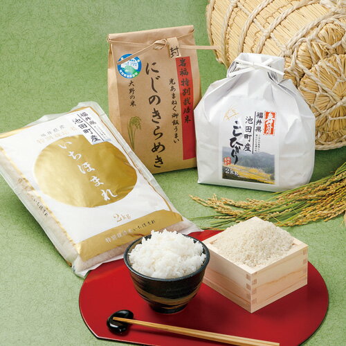 | 22 |  | 【うまいもの福井『かがみや』】 米どころ福井の至福を贈る。 品種ごとに選ぶ楽しみと、味わう喜びをお届けします。 いちほまれ特別栽培米 2kg×1 池田町産こしひかり舞いけだ 2kg×1 にこまる特別栽培米 2kg×1 |